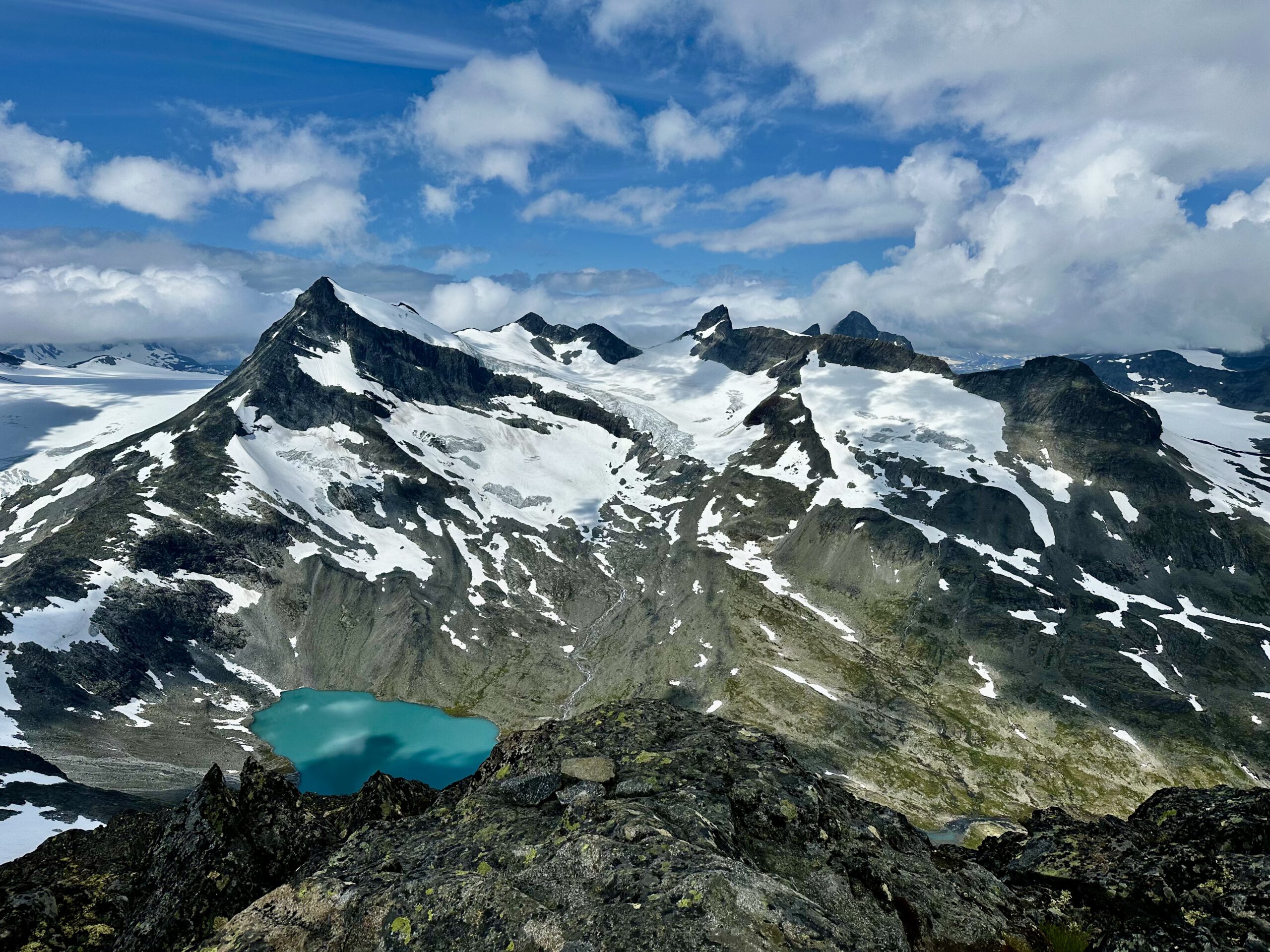 Utsikt från Stetinden över Storebjørn, Smörstabbstindtraversen och omkringliggande glaciärer