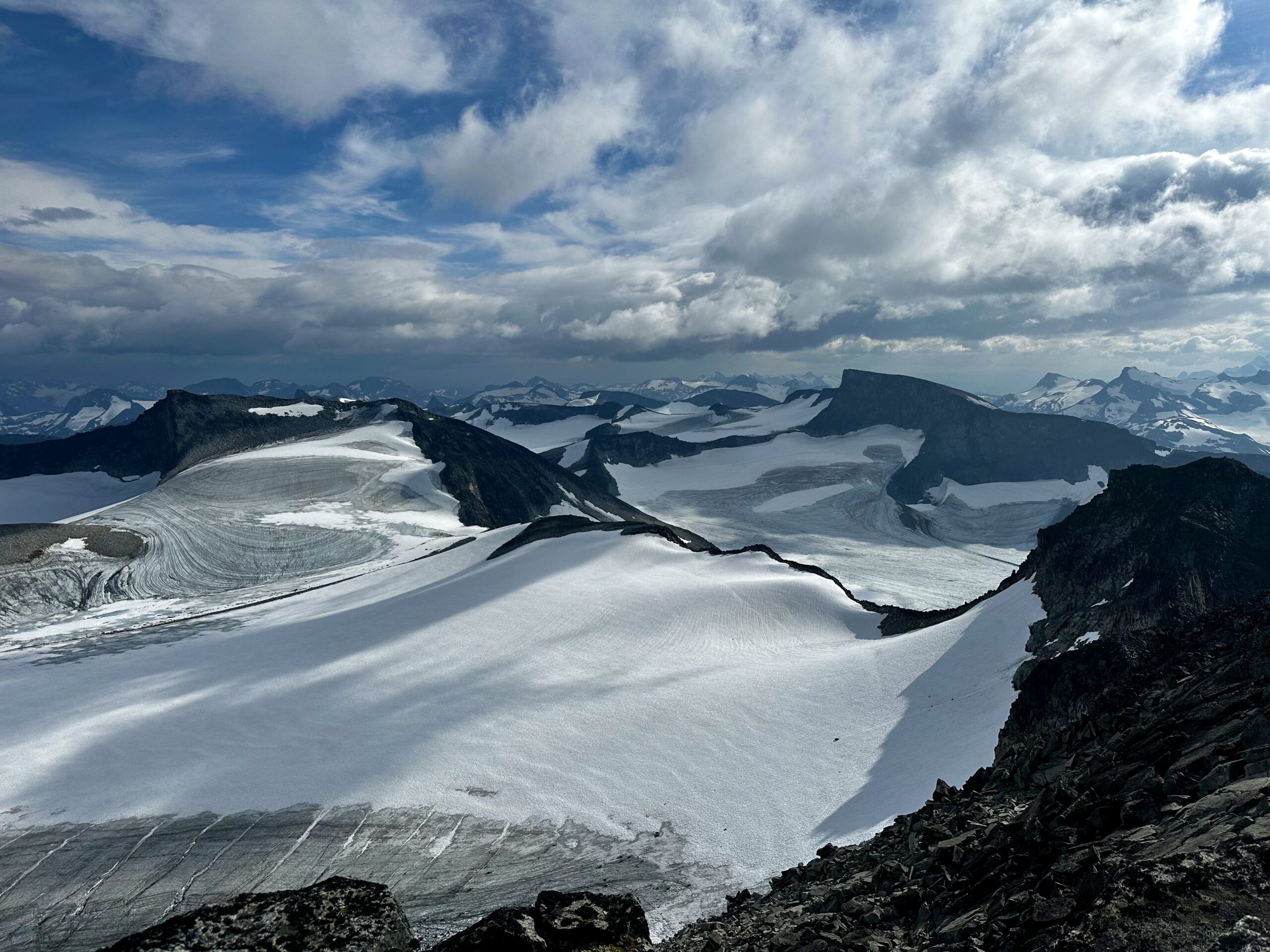 Utsikt från Storjuvtinden över glaciärlandskapet söderut