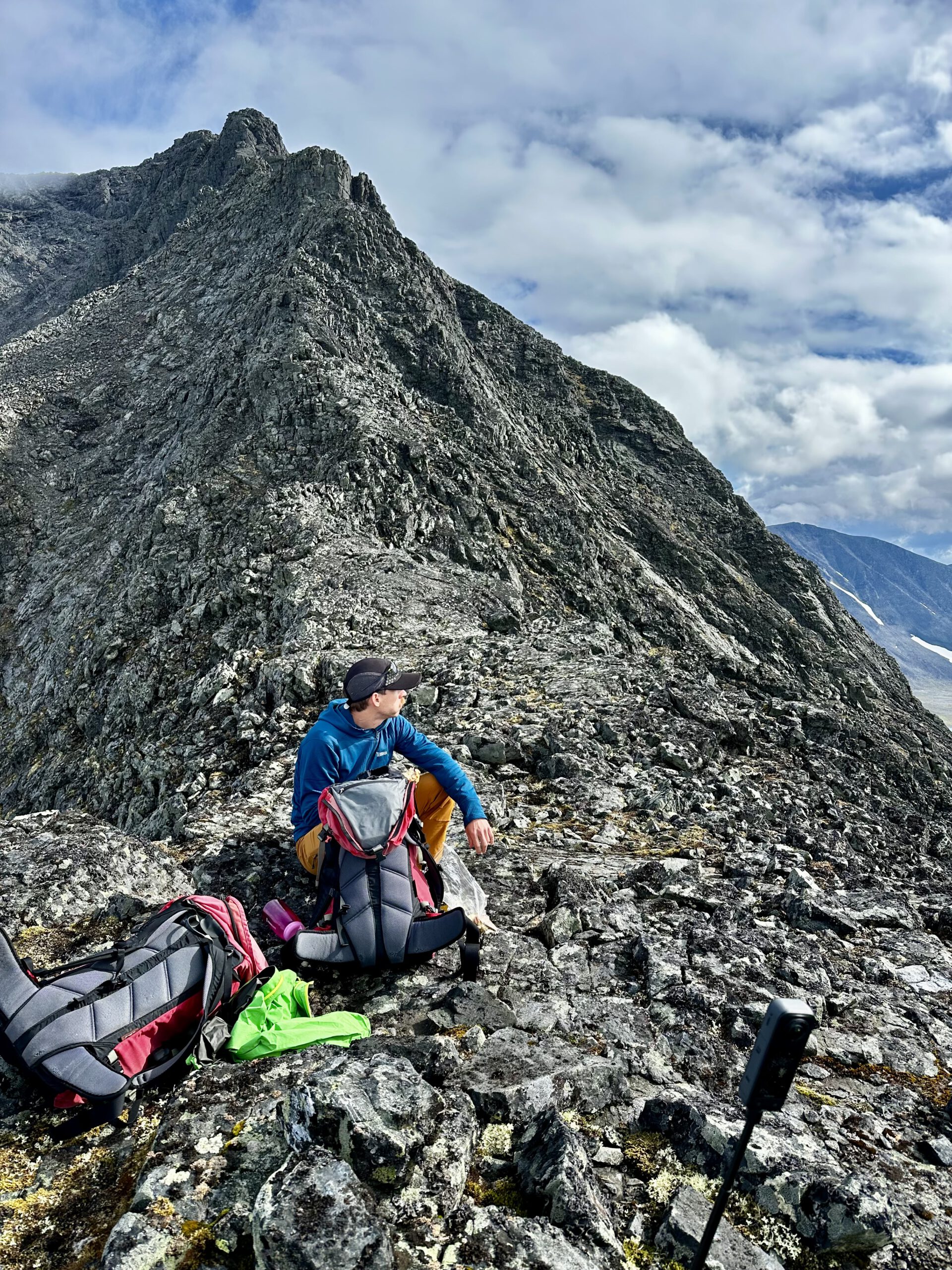 Fikapaus på Kaskasapaktes kam. I bakgrunden kan man se vägen upp mot toppen